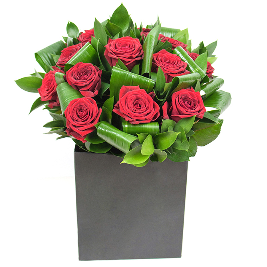 Enhance your space with our stunning bouquet, featuring radiant red roses, graceful aspidistra leaves, and elegant ruscus. This unique design adds sophistication and beauty to any room.